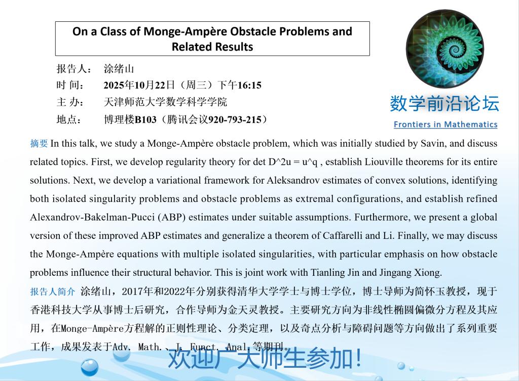 【预告】学术报告(2025-44)10月22日-On a Class of Monge-Ampère Obstacle Problems and Related Results